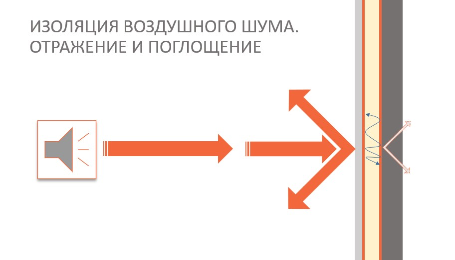 Допустим мы хотим защититься от шума из соседней комнаты. Когда звуковая волна проходит через изолируемую стену, она увязает в слое мягких звукопоглощающих материалов, растрачивая свою энергию. Затем отражается от преграды в виде тяжёлого акустического гипсокартона, усиленного эластичной звукоизоляционной мембраной. В результате, звук не проникает в помещение, а попадает в ловушку между двумя массами – изолируемой стеной и обшивкой из ГКЛ, и постепенно угасает.