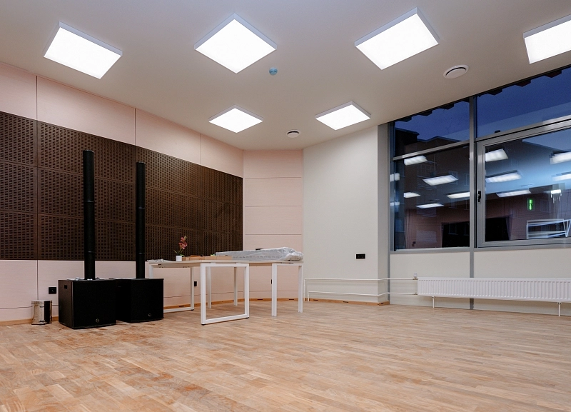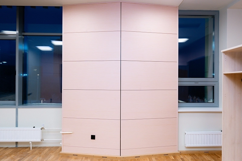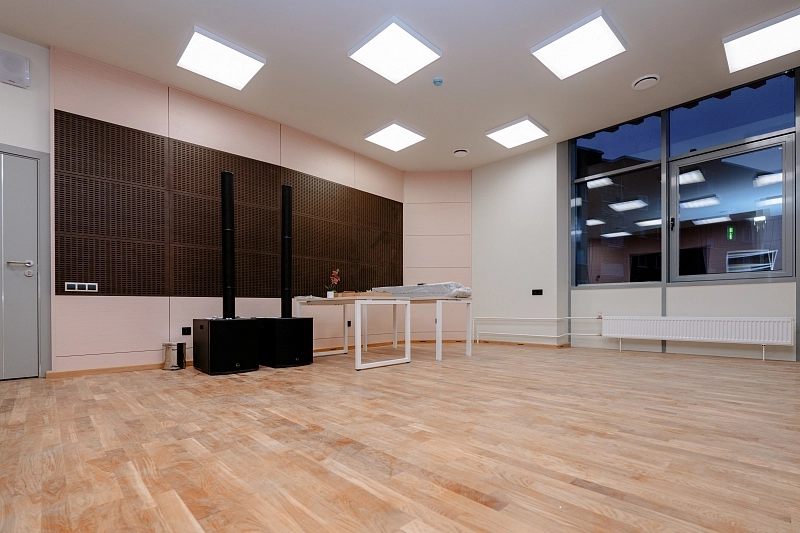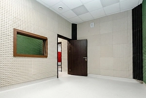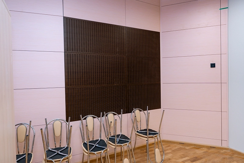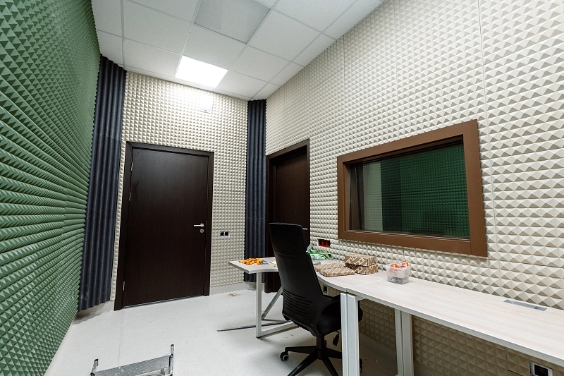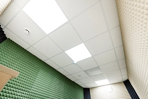 Кроме того, для обеспечения идеальной акустики в учебных классах и хореографическом зале мы поставили и смонтировали специальные акустические панели Akustiline Ampir на потолке, в студии звукозаписи и аппаратной установили акустические диффузоры SAB Acoustic Premium, а в студии вокала – панели Belner Classic и Acoustic с заполнением минеральными плитами Стопзвук БП. Для звукоизоляции потолков использовались сэндвич-панели АкустикГипс Basic.